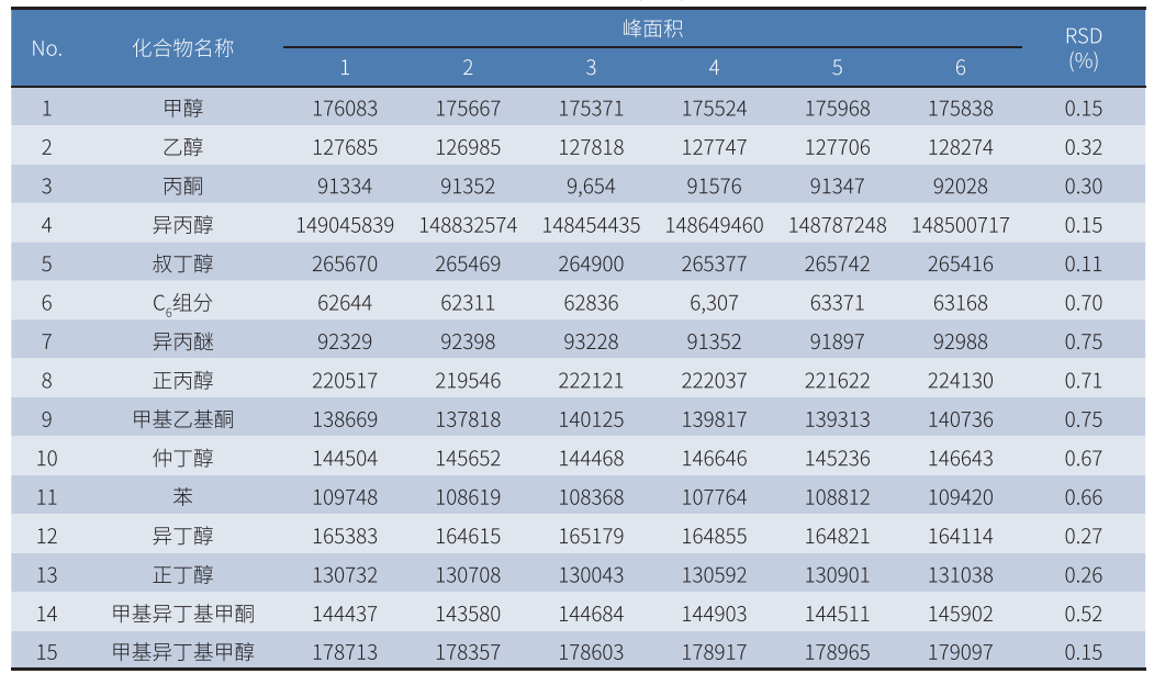 本文使用岛津气相色谱仪GC-2010 Pro,参考国家标准,采用校正面积归一法,建立了测定工业用异丙醇含量的方法。取异丙醇及杂质标准混合溶液,连续6针进样,异丙醇及其杂质峰面积RSD值均小于1 %,完全满足日常检测的要求。该方法可为工业用异丙醇质量控制提供参考。