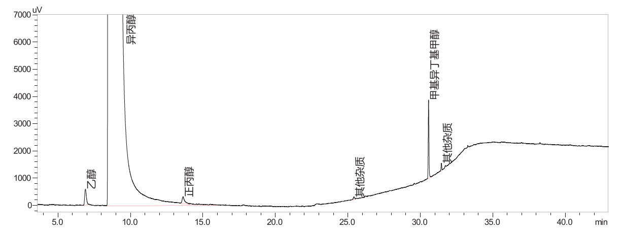 按照标准,配制异丙醇及其杂质的标准混合溶液,经气相色谱仪测定,得到异丙醇及杂质色谱图如下。