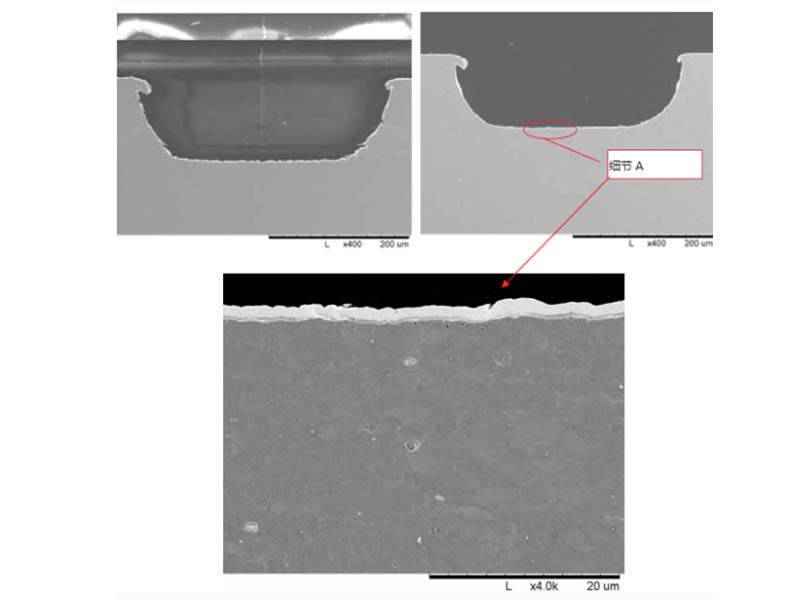 由于之前机械抛光效果很差,所以需要采用8 kv的电压抛光一个小时,通常情况是只需要20分钟。金线(铜线)的去除量要比硅多,所以两种材质已经不在同一平面上了(不同的聚焦面)。然而,下图还是能很好地告诉我们经过离子束抛光后表面的制备质量得到了明显的提高。