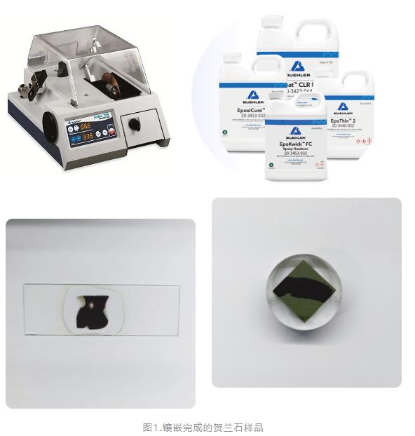 取一块贺兰石印章,先用标乐IsoMet 1000切割机,切割成15×15×15 mm大小的方块和15×15×1 mm大小的薄片。再用标乐EpoxiCure树脂镶嵌成直径30 mm的圆柱形样品,将贺兰石薄片固定在50×20 mm的载玻片上。