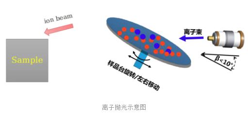 离子抛光示意图如下所示,离子束以一个可设置角度、大面积的轰击在样品表面,工作过程中,样品在自转的同时横移运动达到大面积均匀抛光的效果。在良好的机械抛光之后,离子抛光会去除样品表面几个微米的深度,得到一个无应力损伤的平整表面,满足电镜制样需求。