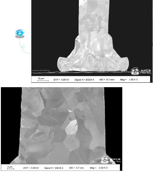 上文提到了徕卡离子研磨仪的离子抛光存在衬度增强作用,可以强化样品内不同相之间的拓扑结构,比如在电子元器件中观察金线时,下图为离子抛光后的效果,可以观察到清晰的晶界。