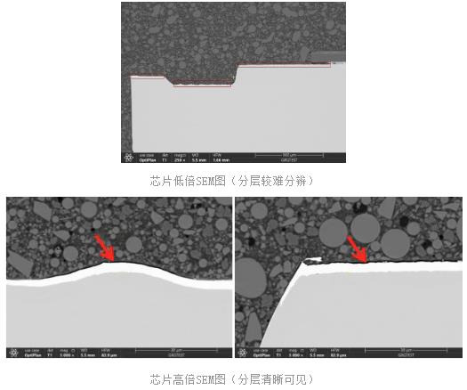在机械磨抛过程中,不可避免的存在延展涂抹现象,导致一些孔隙、缝隙会被掩盖,造成假象,而离子抛光可以去除该影响,同时一些特别小的缝隙,必须在高分辨率下才能辨认,就需要电镜在较高倍数下观察,此时徕卡的离子研磨仪便又有了用武之地,下图为某一芯片观察分层情况,仅机械研磨,就可能存在研磨的碎屑覆盖住分层的情况,经离子束抛光后轻微的分层清晰可见: