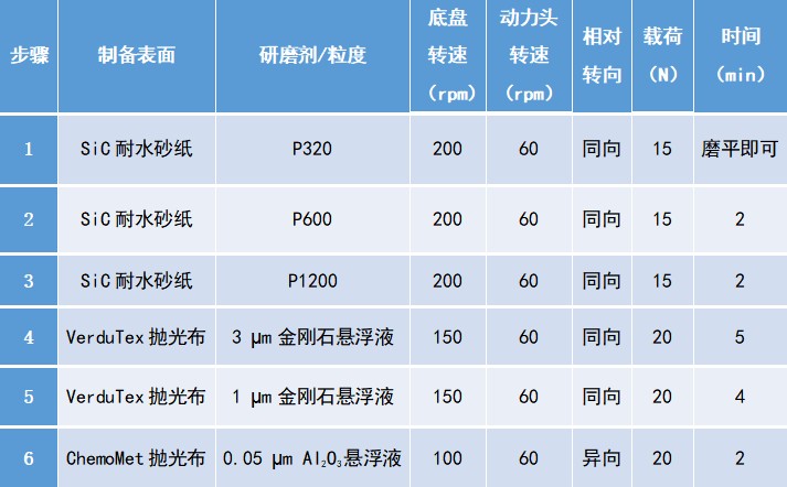 研磨与抛光采用标乐的手自一体磨抛机EcoMet 30的半自动模式。参数如下表所示。