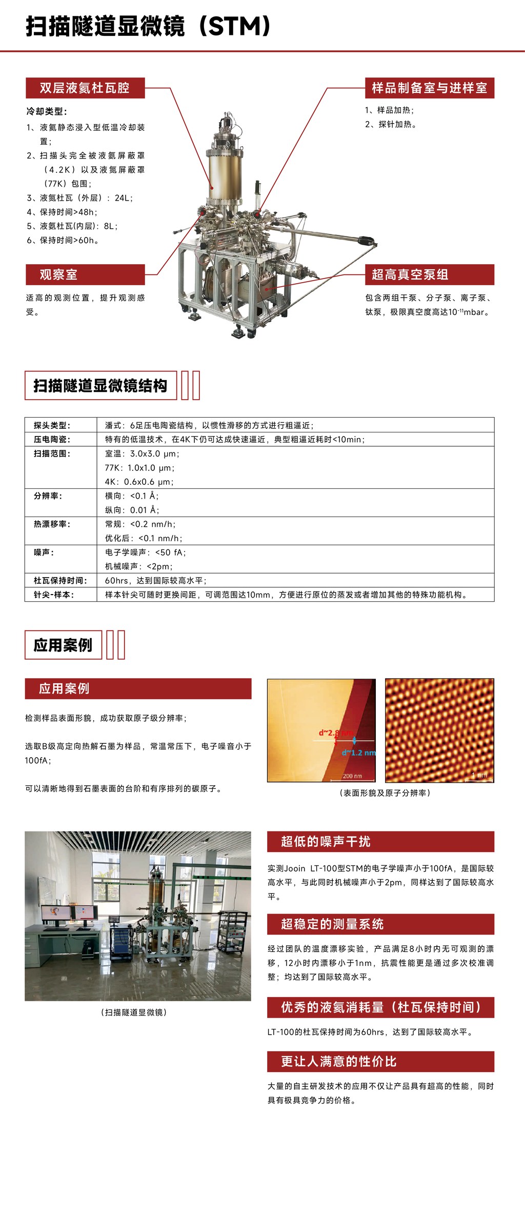 Ultrascan LT-100的关键技术特点包括压电陶瓷步进马达、低温STM探头以及超真空液氦双层杜瓦等。这些技术的应用确保了设备在低温条件下的稳定性和精确性,使其能够在4K的低温环境中工作,为科研人员提供了一个强大的工具来探索材料的表面特性和行为。