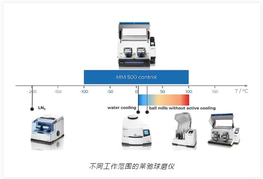 对机械化学法而言,控制反应条件(比如研磨时间、温度、转速,施加的撞击力等)非常关键。对于市面上大多数球磨仪,可以通过设置机器参数轻松改变转速和研磨时间等,但在温度控制上存在很大的挑战。温度对反应效率有重大影响,甚至可以决定反应类型和反应的生成物。作为实验室粉碎研磨设备领域的领导者,莱驰为客户提供宽泛的球磨仪产品选择,从 -196℃低温研磨,到-100℃~100℃的温控研磨,为客户提供成熟稳定的控温研磨方案。