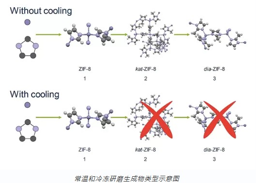 通过机械化学法合成ZIF-8,采用氧化锌和2-甲基咪唑为有机配体放进球磨仪中研磨。研究表明,常温下研磨会有中间衍生物kat-ZIF-8和dia-ZIF-8生产,降低产量。