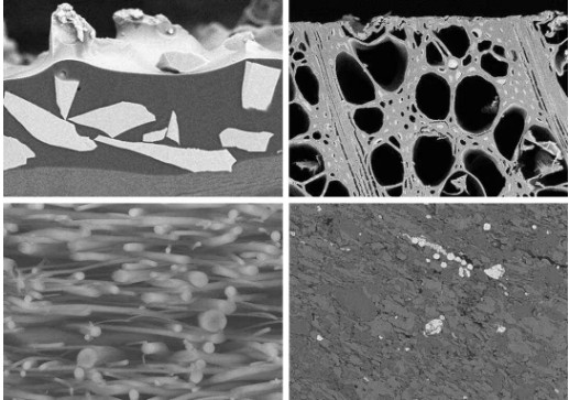 图片说明1:SiC 砂纸的横截面;2:单板的横截面;3:在 -120°C 下制备的同轴聚合物纤维(水溶性);4:油页岩(纳米孔),使用 EM TIC 3X(旋转台)显示,总样品尺寸 Ø 25 mm
