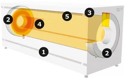 内部结构 1) 外壳 2) 端部保温材料 3) 外壳保温材料 4) 加热元件 5) 内部保温材料 矩形壳体具有用于外部壳体对流冷却的槽。采用由低蓄热量的陶瓷纤维材料制成的隔热材料,可将热传导降至很低。 在管式炉内,加热元件由真空形成的纤维构成,纤维中含有自由辐射的加热元件,加热丝内嵌在陶瓷保温材料中。 与传统的加热方法相比,5毫米粗的加热丝与高品质的S型控温热电偶相结合,保证了加热元件长寿命和温度稳定性。采用高品质的S型控温热电偶。此外,可实现8区控温,温度控制精确,均匀性好。