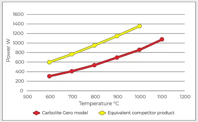 Energy consumption for exemplary Carbolite Gero TS1 12/60/600 model (red) and equivalent competitor product (yellow); measured at each temperature after 2 hours soak.